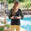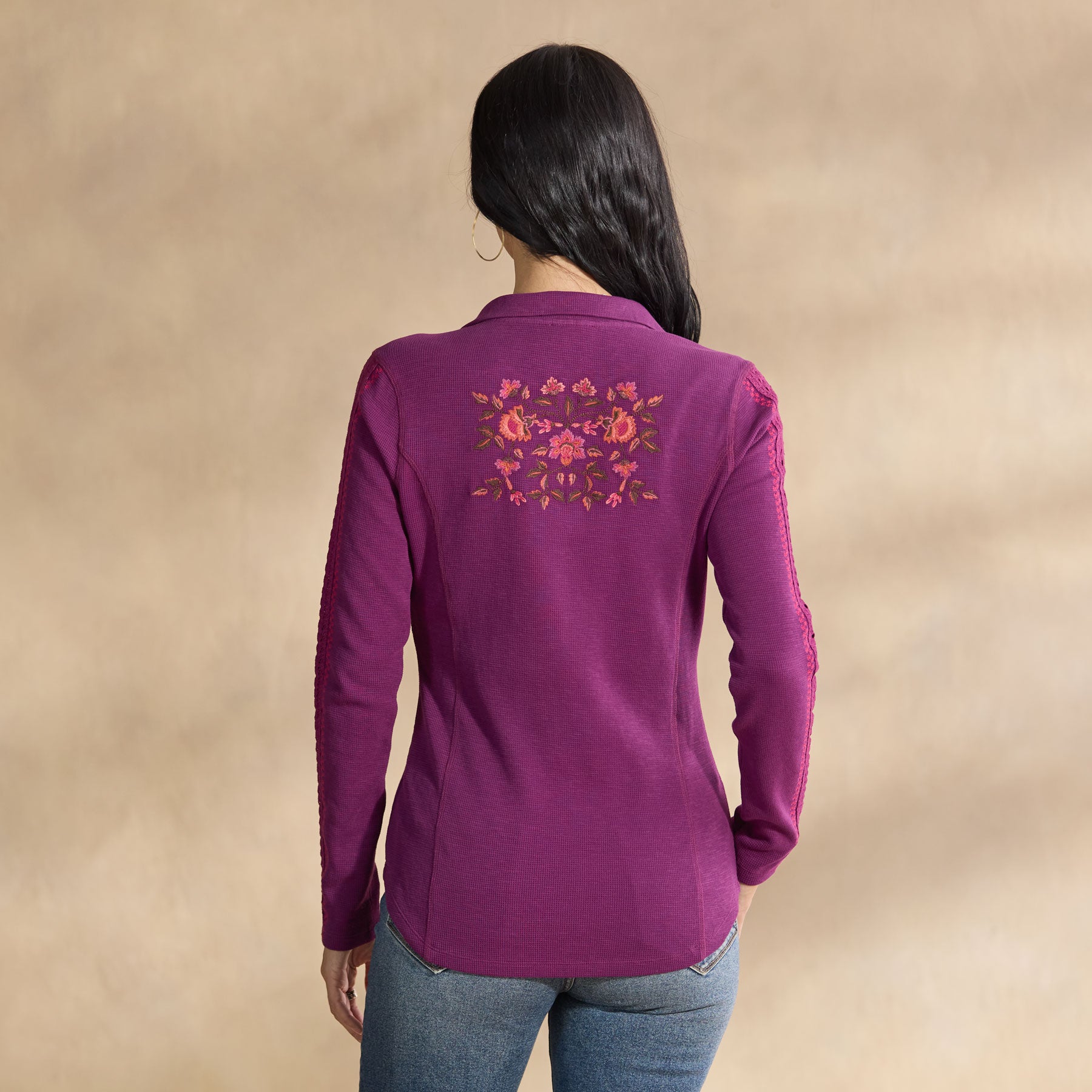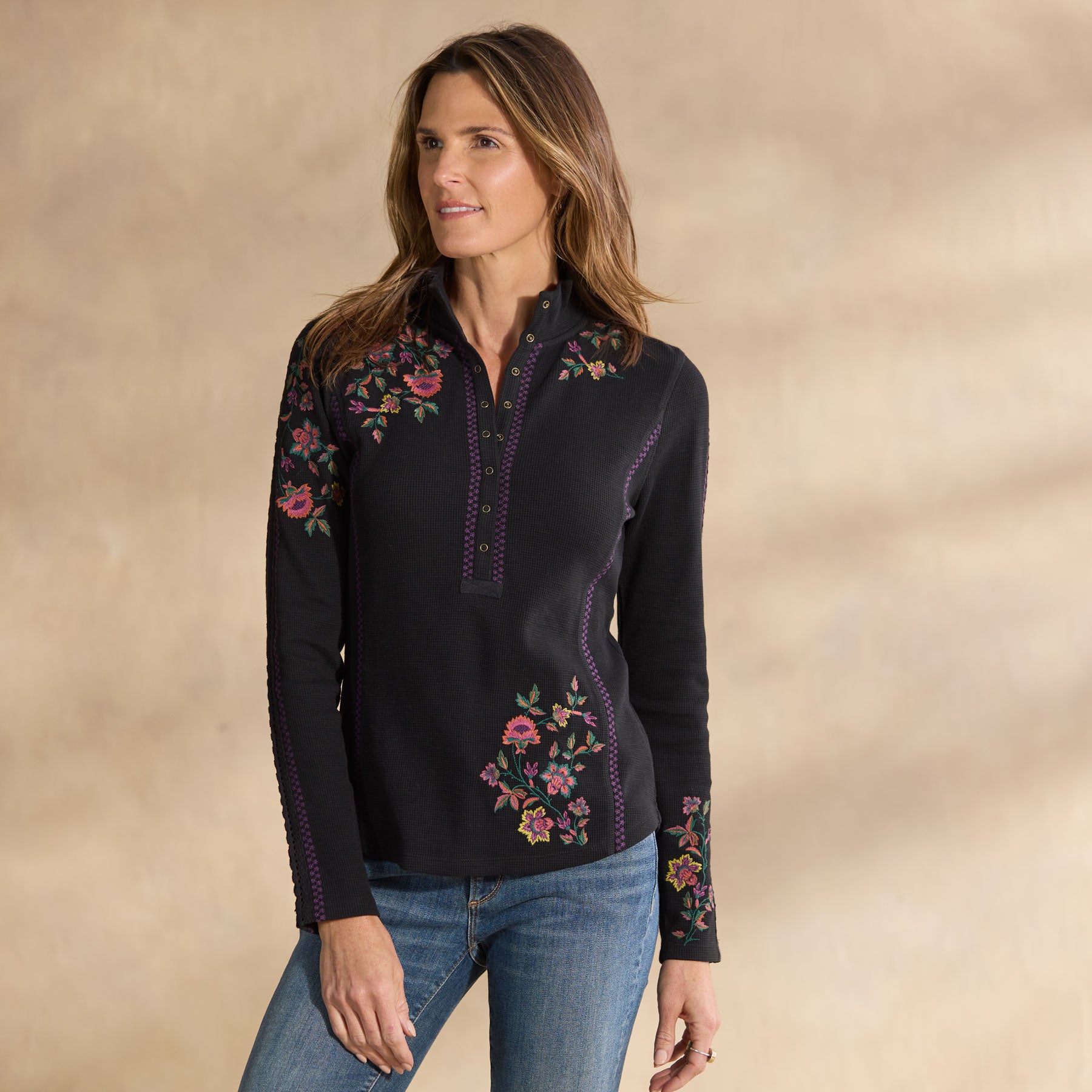 So flattering. our mock neck henley is blooming with stunning. multi colored floral embroidery. feminine lace insets at the sleeves and metal snaps at the placket. Princess seams. Cotton. Machine wash. Imported. Exclusive. Sizes XXS (00). XS (0–2). S (4–6). M (8–10). L (12–14). XL (16–18). Approx. 23l.