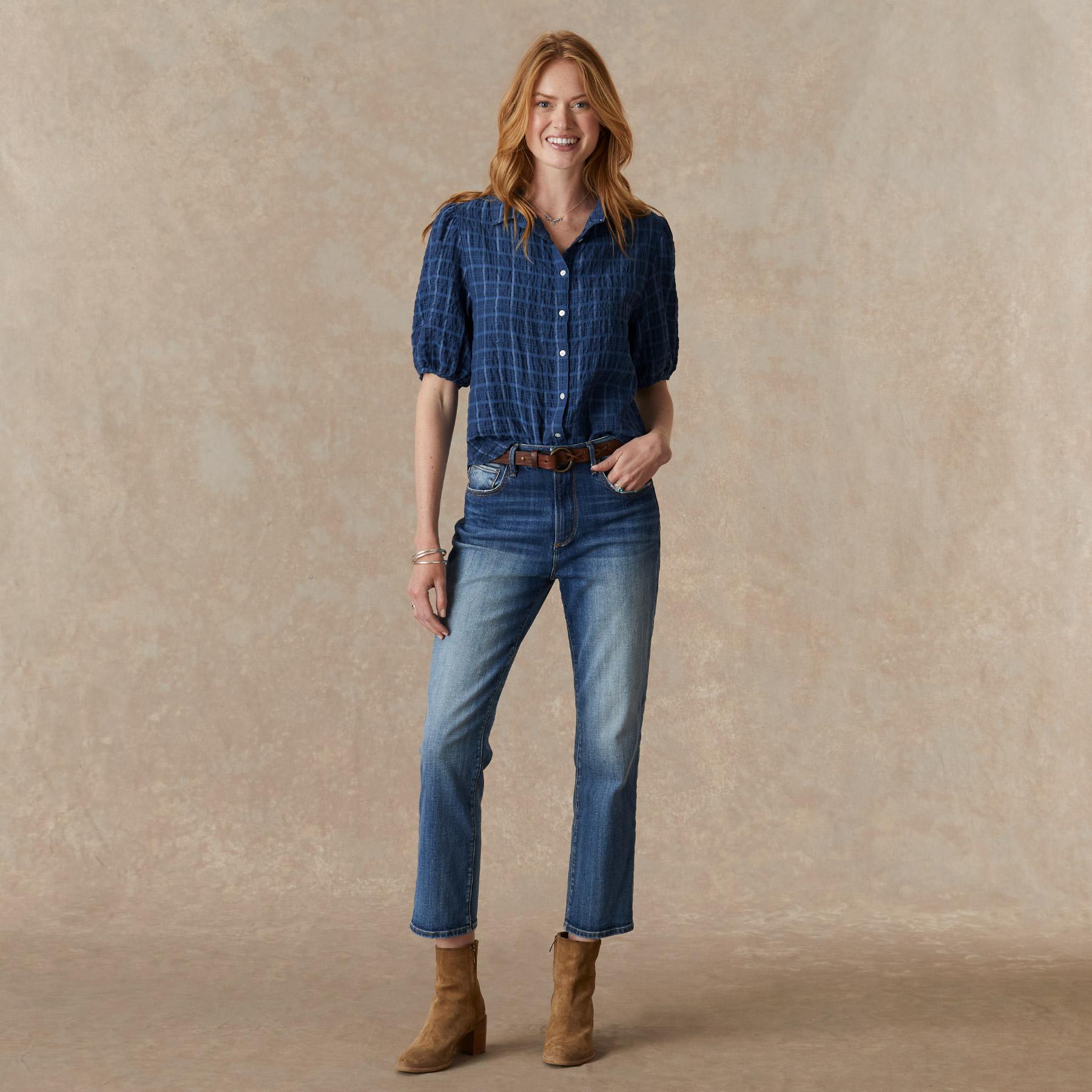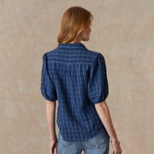 This relaxed button-down shirt features a textured windowpane print and elastic at the sleeves. Tencel/rayon/nylon. Machine wash. Imported. Sizes XS (0-2). S (4-6). M (8-10). L (12-14). XL (16-18). XXL (20-22). Approx. 25l.