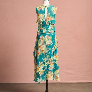 A gorgeous floral print enchants on our romantic dress. with angled. fluttery ruffles. asymmetrical hem. deep side slit. smocked neckline and keyhole button back. Fully lined. Viscose. Machine wash. Imported. Exclusive. Sizes XXS (00). XS (0-2). S (4-6). M (8-10). L (12-14). XL (16-18). Approx. 40.5.