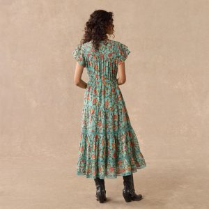 Feminine and flowing. a palette of gorgeous florals with contrast border print details. pintucking. elastic waist. double flutter sleeves and tiered hem. Fully lined. Cotton/silk. Hand wash. Imported. Exclusive. Sizes XXS (00). XS (0?C2). S (4?C6). M (8?C10). L (12?C14). XL (16?C18). Approx. 49.5l.