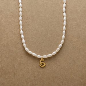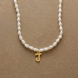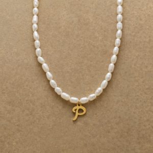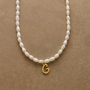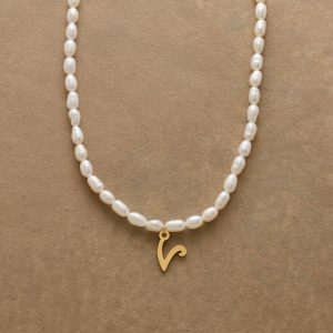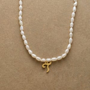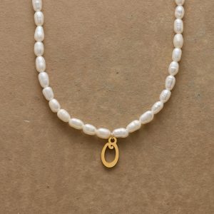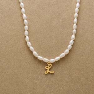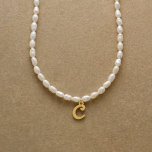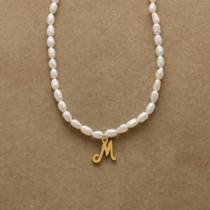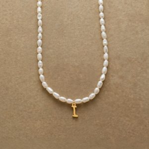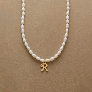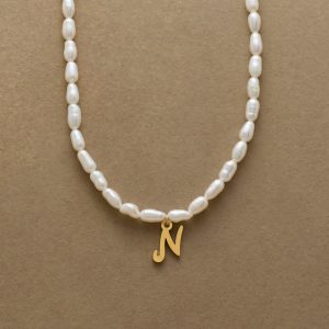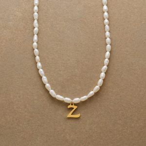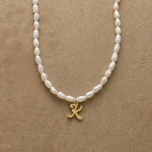 A letter-perfect example of everyday elegance. this string of freshwater pearls can be customized with a script alphabet charm. Charm and lobster clasp made of 14kt gold-plated stainless steel. Handcrafted with silk cord. USA. 15?C16 1/2l.