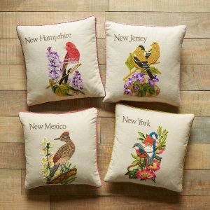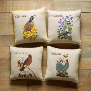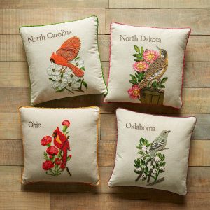 Celebrate the states you love to visit or the states you’ve called home with our exclusive decorative pillows hand knotted. textured and embroidered in vibrant. colorful detail. Each pillow features the iconic 1982 American stamp design with the bird and flower from each state proudly represented. Linen. Imported. 18 sq.