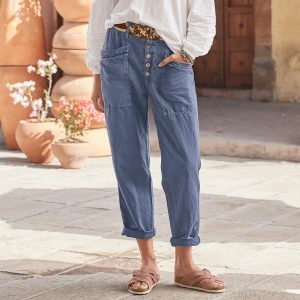 Easy. button fly pants with elastic back. Ladder lace detail. Linen/cotton. Machine wash. Imported. Exclusive. Sizes 2 to 16. 28 inseam.