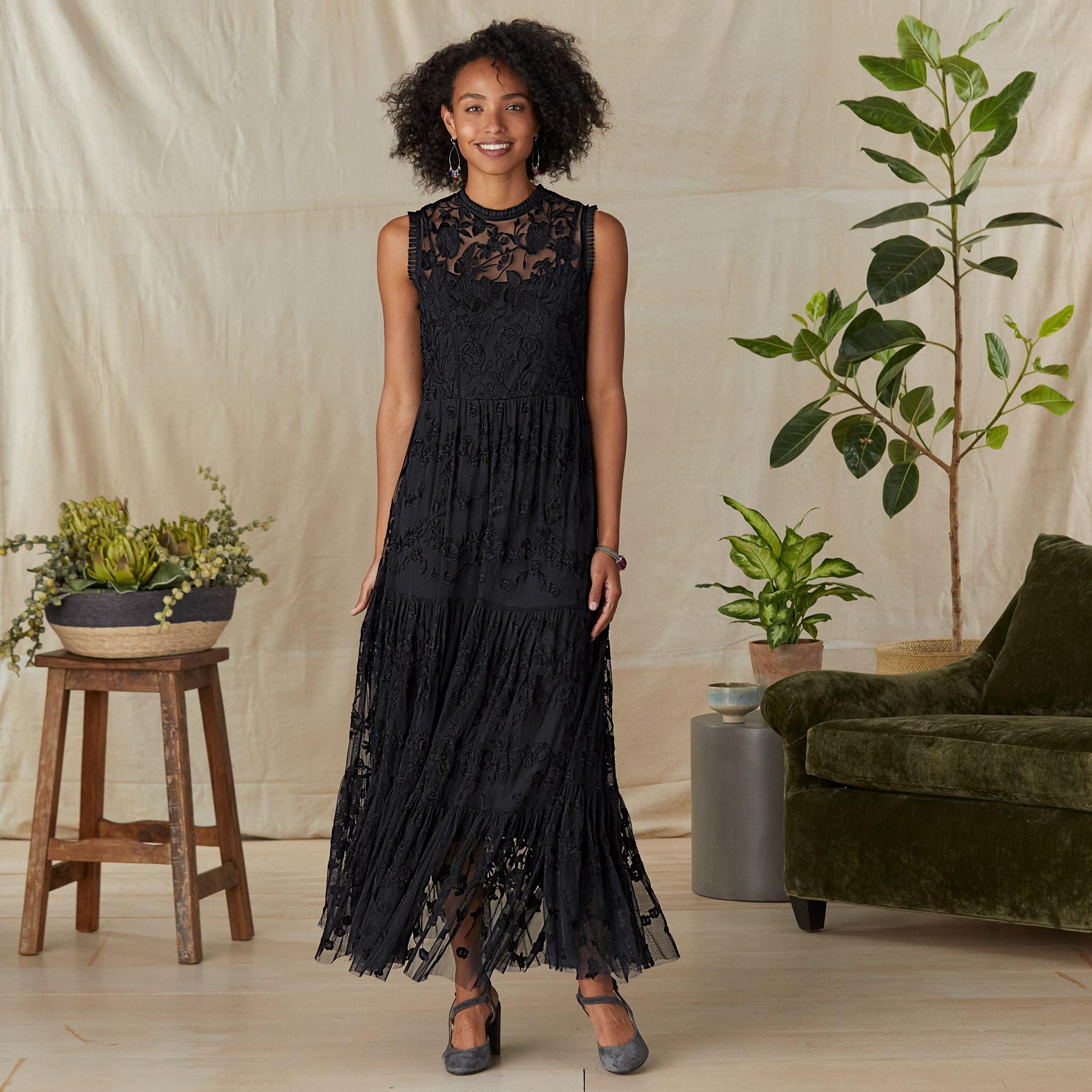Dreamy lace enchants in this ruffle tiered. sleeveless. maxi dress with tonal embroidery and lining. Polyester. Dry clean. Imported. Sizes XS (0-2). S (4-6). M (8-10). L (12-14). XL (16). Approx. 55l.